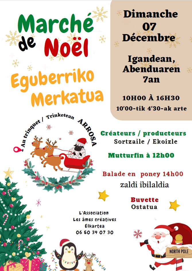 Un marché de Noël organisé par l’association « les âmes créatives » aura lieu le dimanche 7 décembre 2025 de 10h00 à 16h30 au trinquet Lamin Kantxa d’Arrossa.
