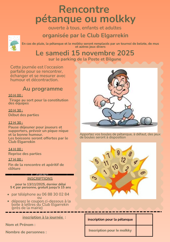 Une rencontre pétanque ou molkky ouverte à tous, enfants et adultes, et organisée par le club Elgarrekin le samedi 15 novembre 2025 sur le parking de la Poste et de Bilgune.