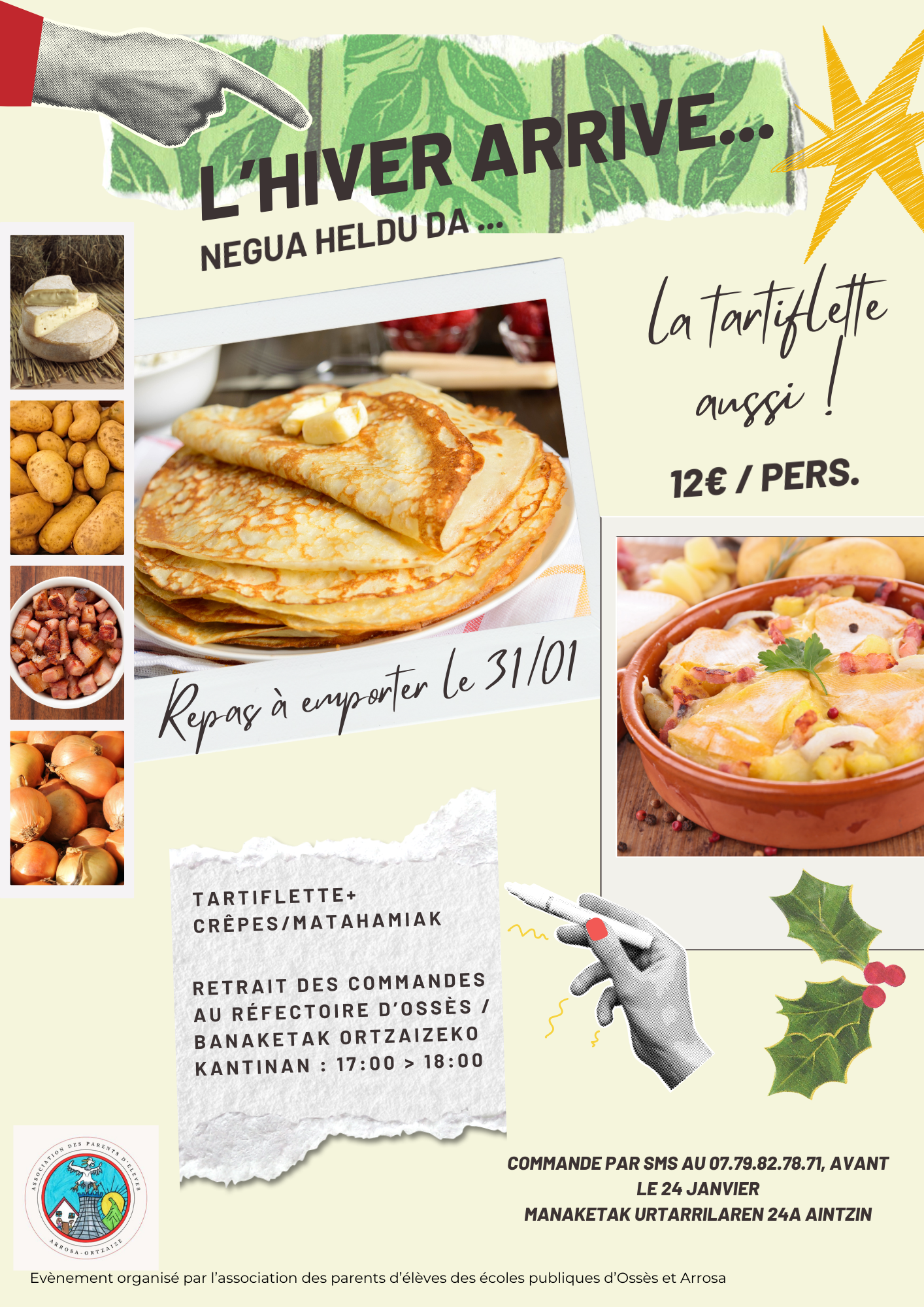 Pour la troisième année consécutive, l’Association des Parents d’Élèves vous propose son désormais incontournable repas tartiflette, parfait pour se réchauffer le cœur… et l’estomac !